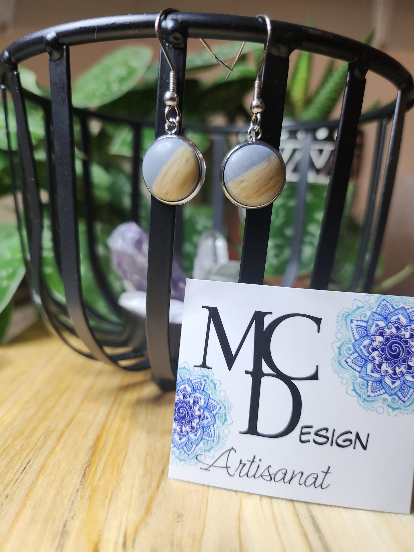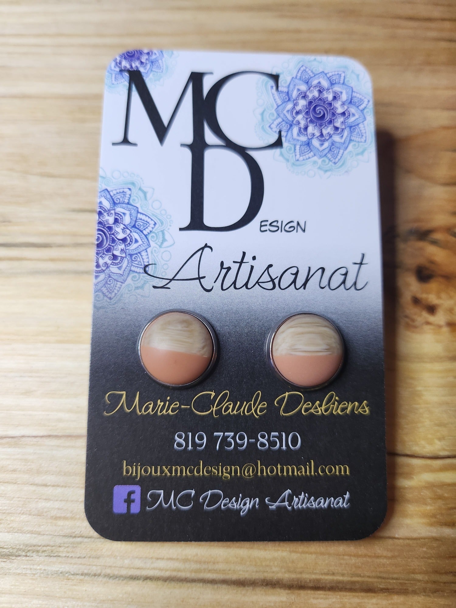 Superbes boucles d'oreilles en résine, imitation bois, disponible en version clous ou en version longues dans un autre publication. Le diamètre est de 12mm sur finition en acier inoxydable, donc hypoallergéniques.