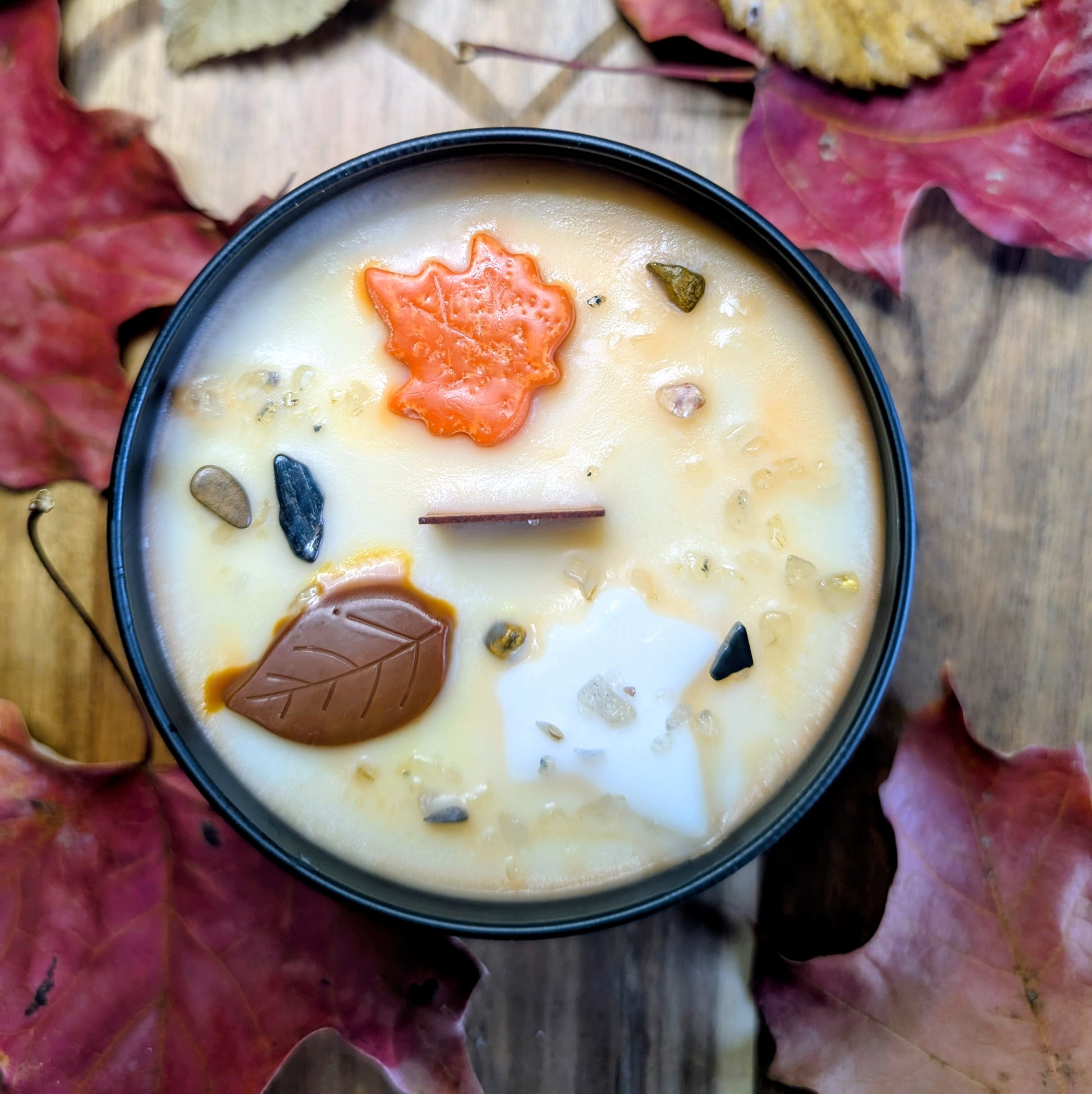 Fait à la main avec de la cire de soya biologique et mèche de bois.