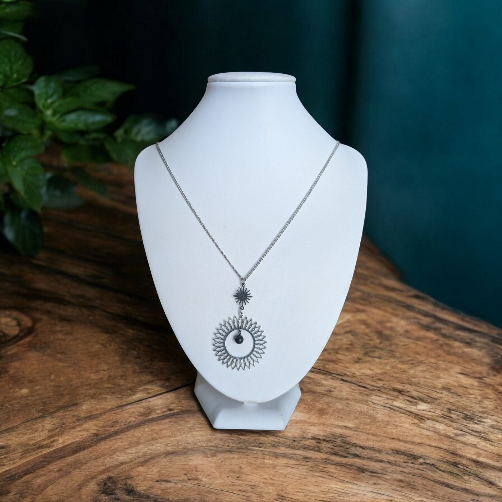 Magnifique collier long, fait avec 2 breloques soleil noir et argent. Collier très versatile et se porte avec beaucoup de style.