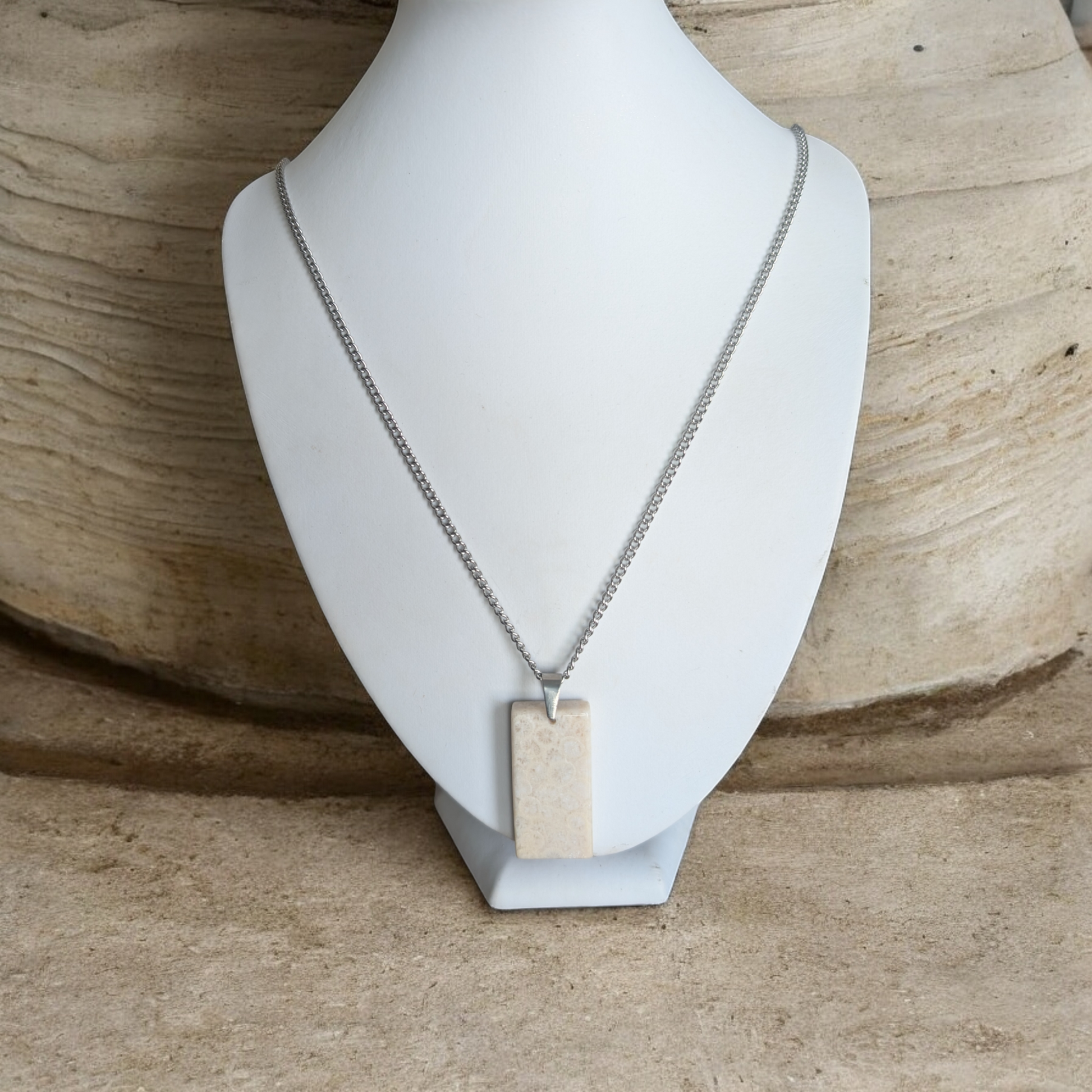 Beau collier simple avec fossil de coquillage de forme rectangle 0,75 po par 1,5 po environ